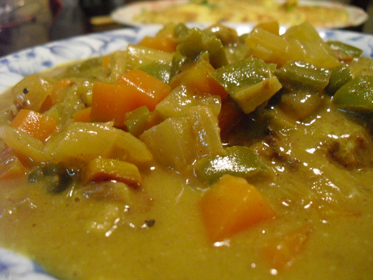 人参、玉ねぎ、セロリ、ピーマンを炒めてカレー粉とブイヨンスープで煮ます。