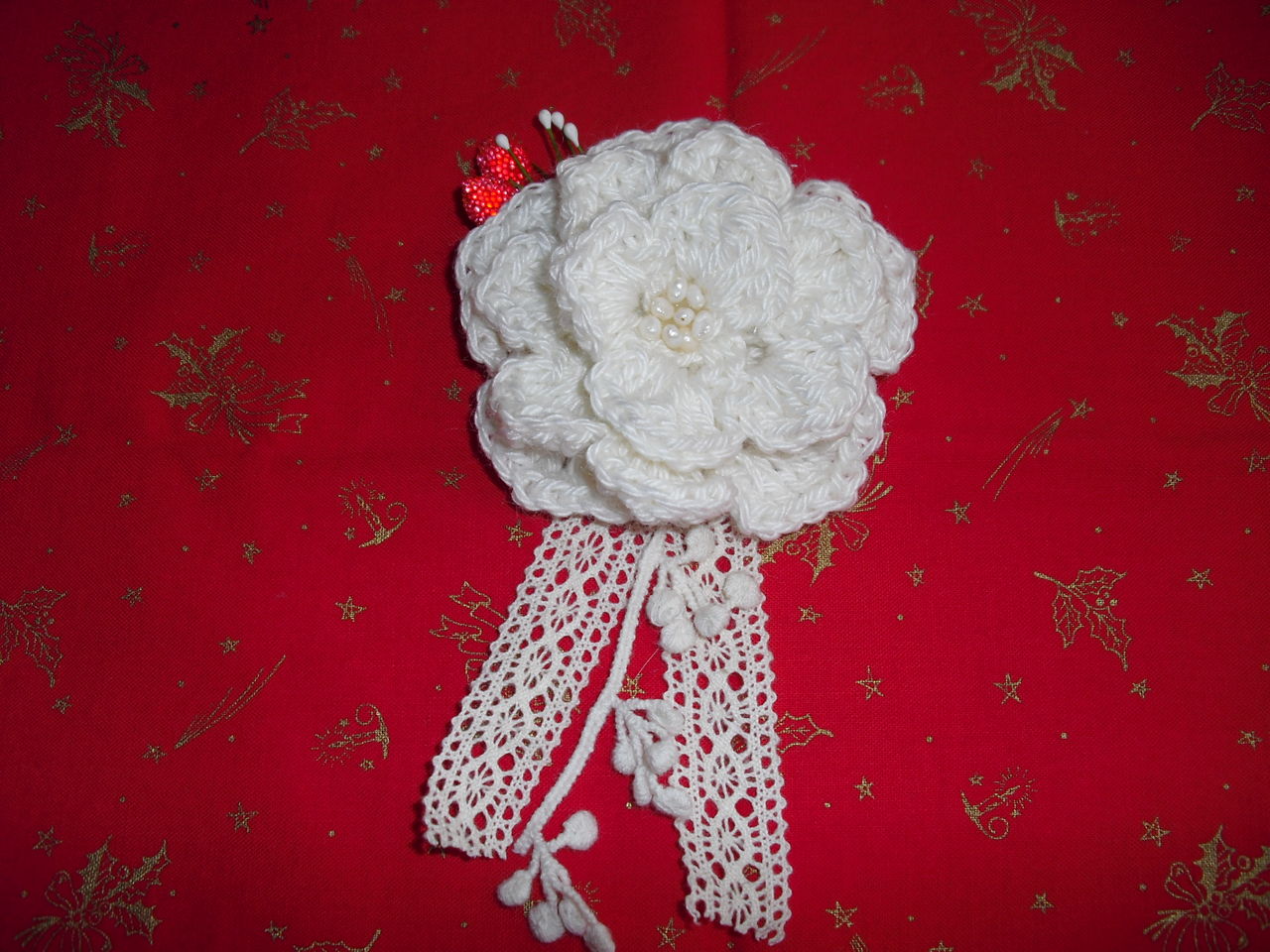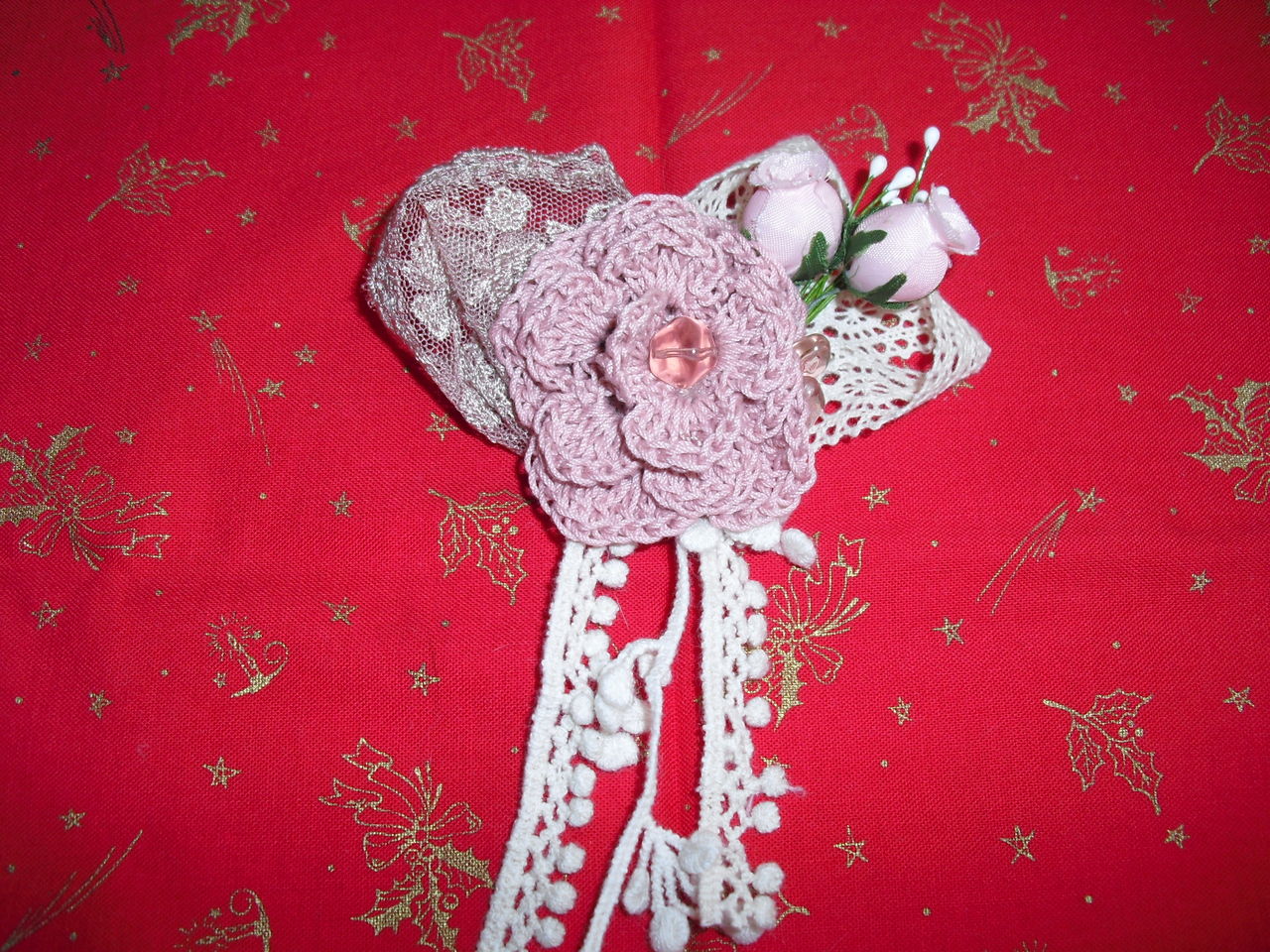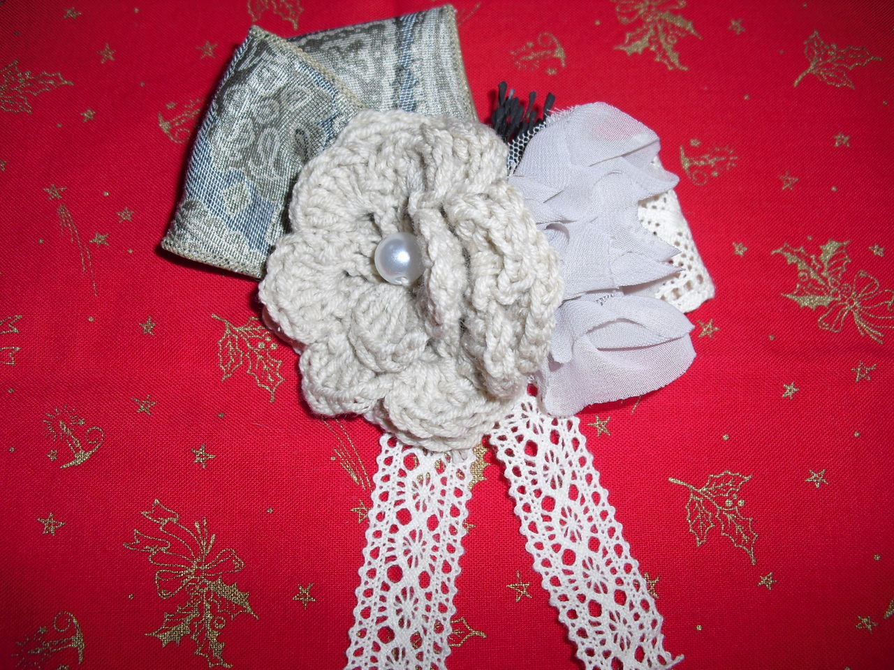麻の糸やコットンで編んだお花をモチーフにしたコサージュ3点。