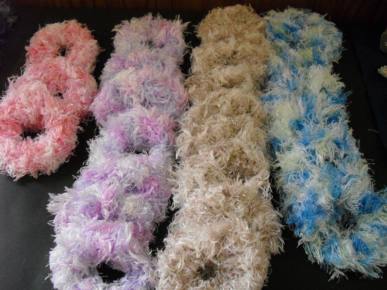 これらはモコモコの毛糸で指編みで作ったシュシュです。