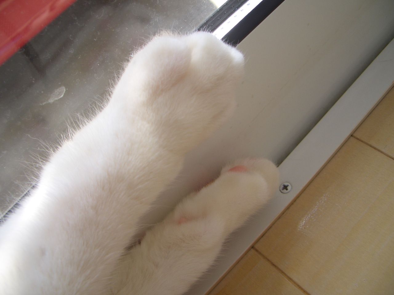 外に真っ白な猫さん、雨でずぶぬれ・・