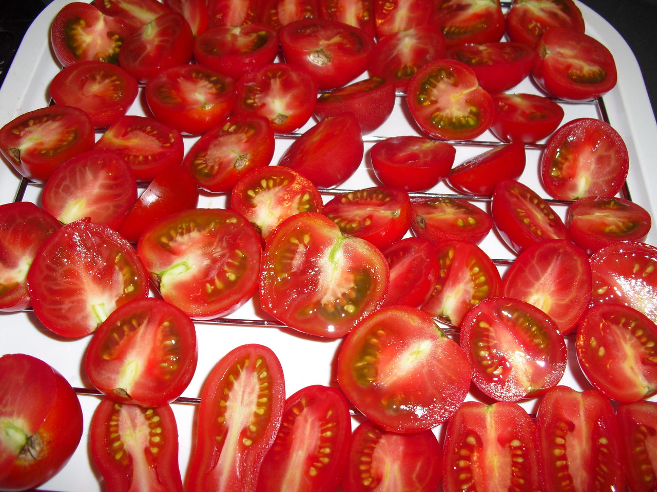 トマトを洗って半分に切って天板の網の上に並べます。