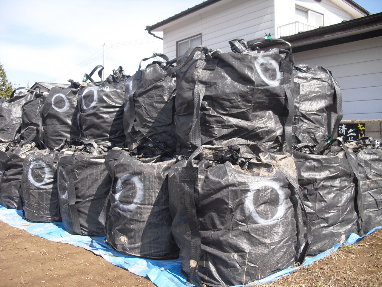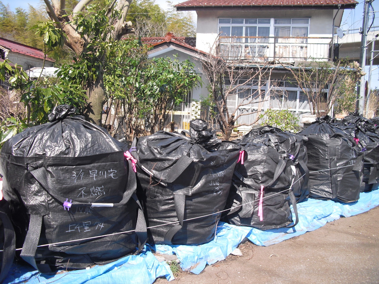 除染後の家の周りには汚染物質が袋に入れられて運ばれるのを待っています。