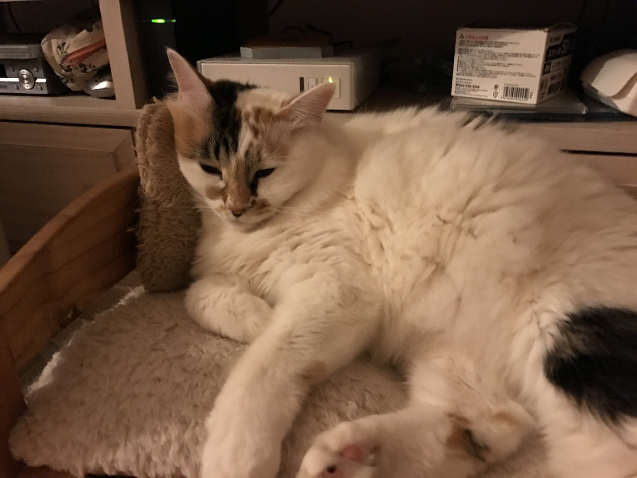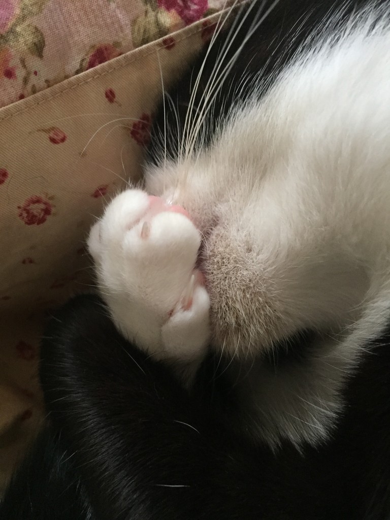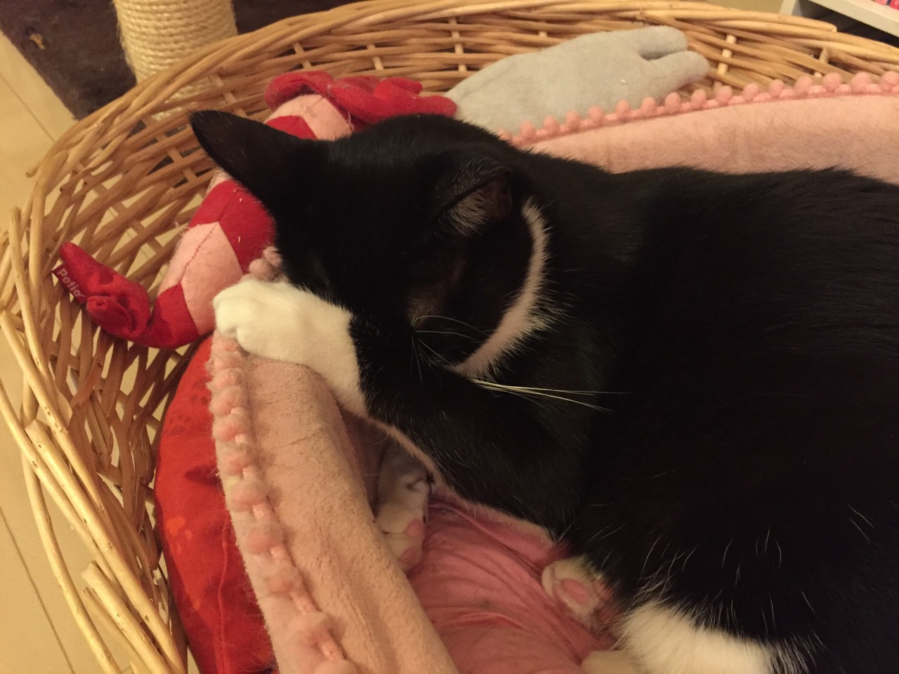 私のお腹の上で自分の後ろ足をちゅぱした後、すまん寝してしまったブルース。