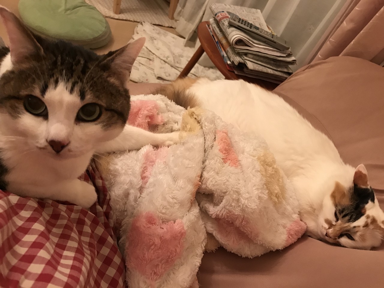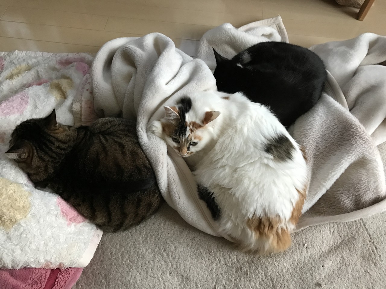 仕事から帰ってきたら暖房が入っていない部屋で寒かったらしい3匹。