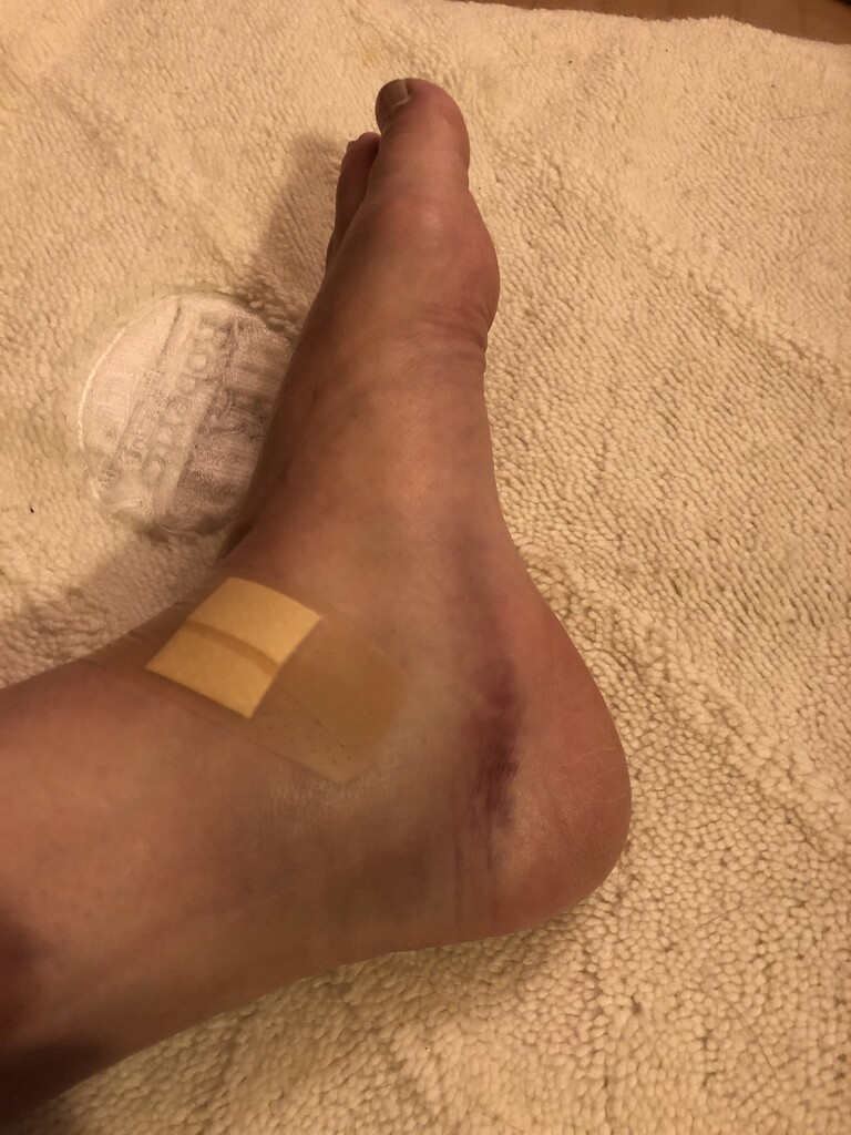 反対側の外側と甲の部分が紫色になってまだ腫れています。