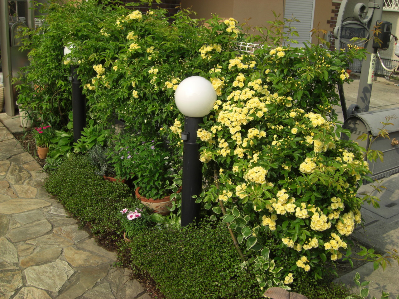 一軒先のお家のモッコウバラが咲きました。
