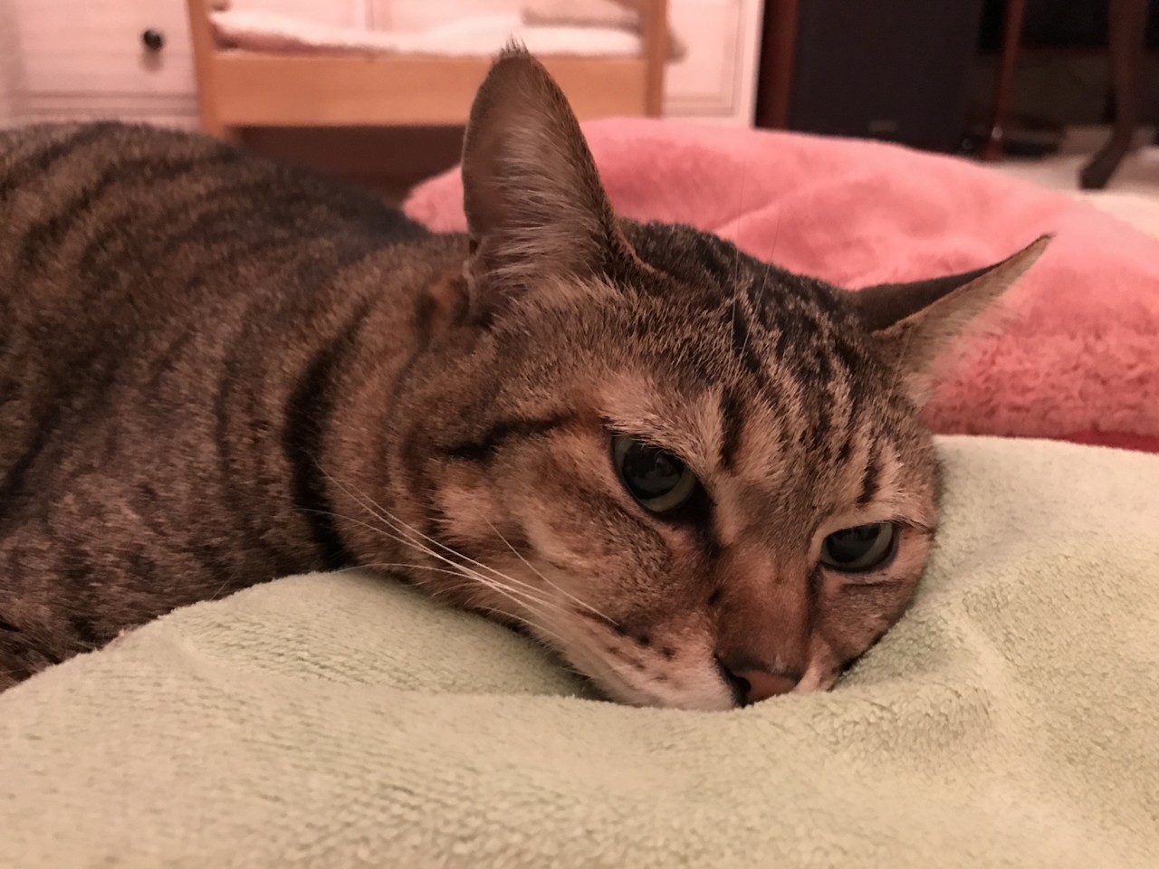 いつもこうやって何かに顎乗せして寝ています。