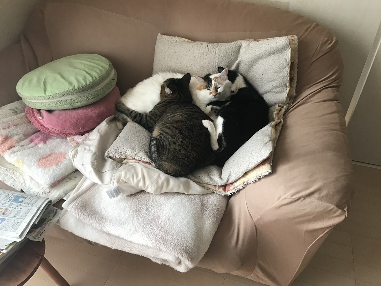先日、寒かったらしく、三匹で猫団子になってました。