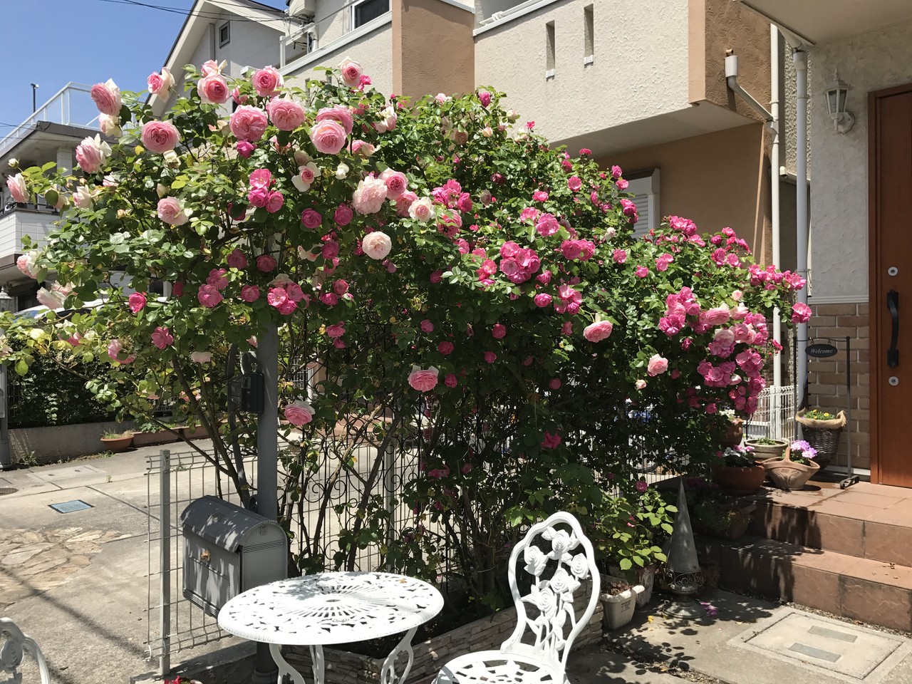 満開のバラ、お隣さん側から見たところ。