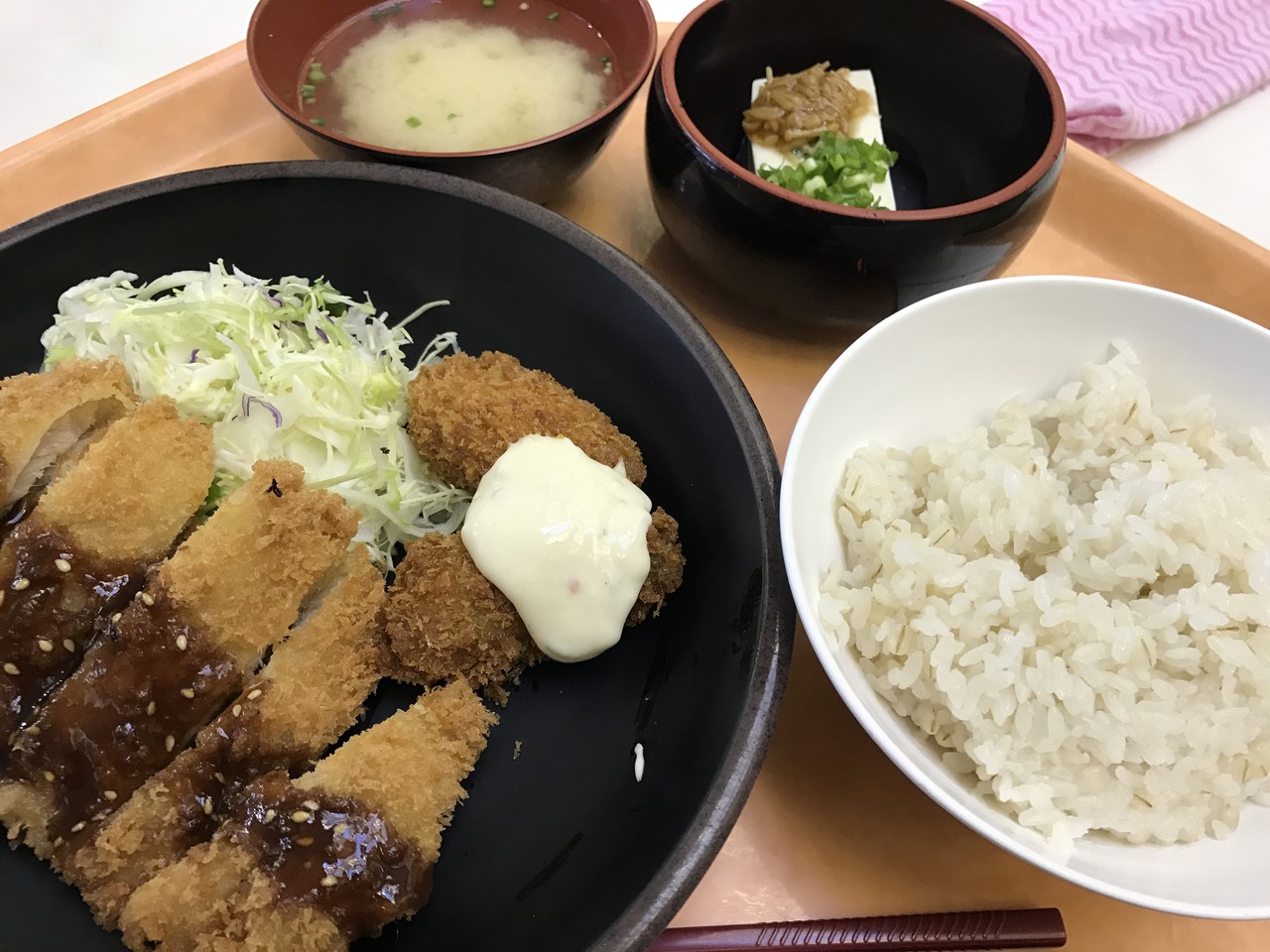 とんかつと牡蠣フライの定食 690円です。